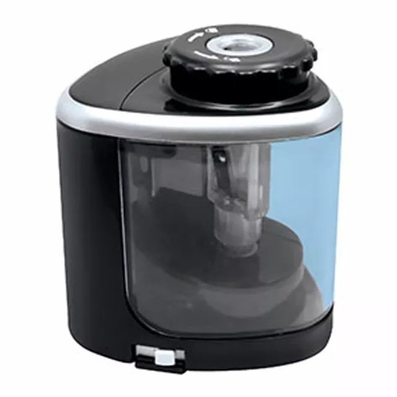 Apontador de mesa automático com depósito grande. Funciona com 2 pilhas AA.