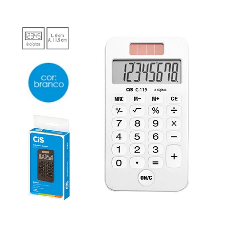 Calculadora de Bolso CIS 119 Branca. Auto desliga. Possui capa protetora. Bateria solar ou 1 (uma) bateria. Com 8 dígitos.