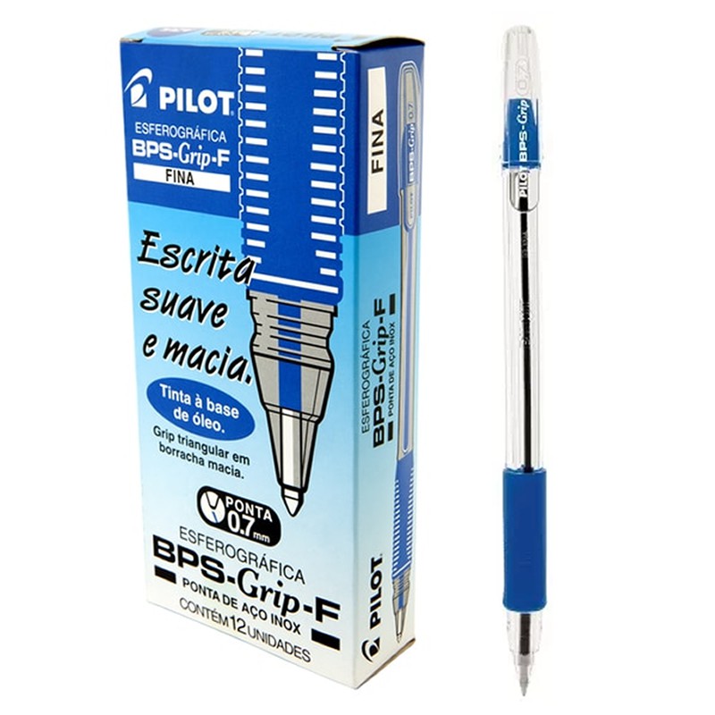 Ponta de aço inox grip triangular em borracha macia. Esfera de 0.7mm(fina) e corpo transparente. Tinta à base de óleo. Marca: Pilot. Caixa com 12 unidades.