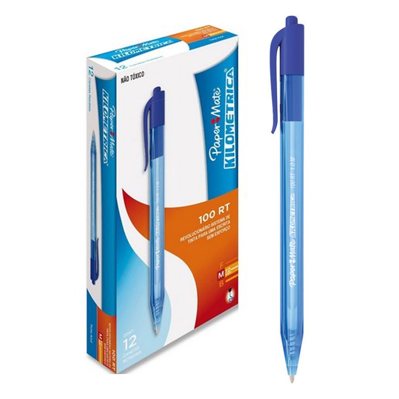 Caneta Retrátil Esferográfica Paper Mate Kilometrica 100 Rt Azul CX C/ 12 Un