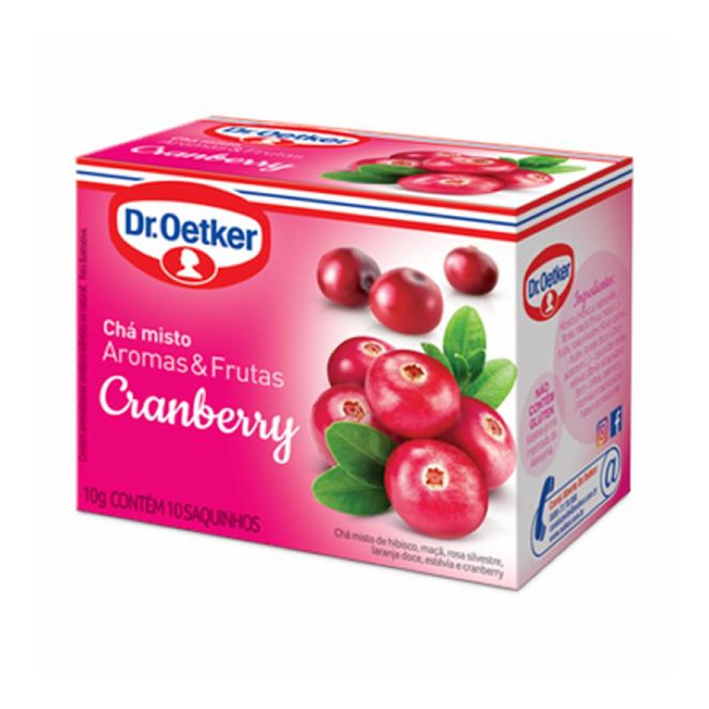 O Chá Misto Aromas e Frutas Cranberry é elaborado com ingredientes à base de frutas e ervas, são infusões especiais com sabores e aromas naturais e delicados. Embalagem: CX.10 Sachês. Marca: Dr. Oetker.