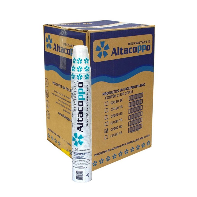 Copo plástico descartável 200ml 1ª linha. Marca: Altacoppo. Caixa com 100 unidades. Cor: Branco.