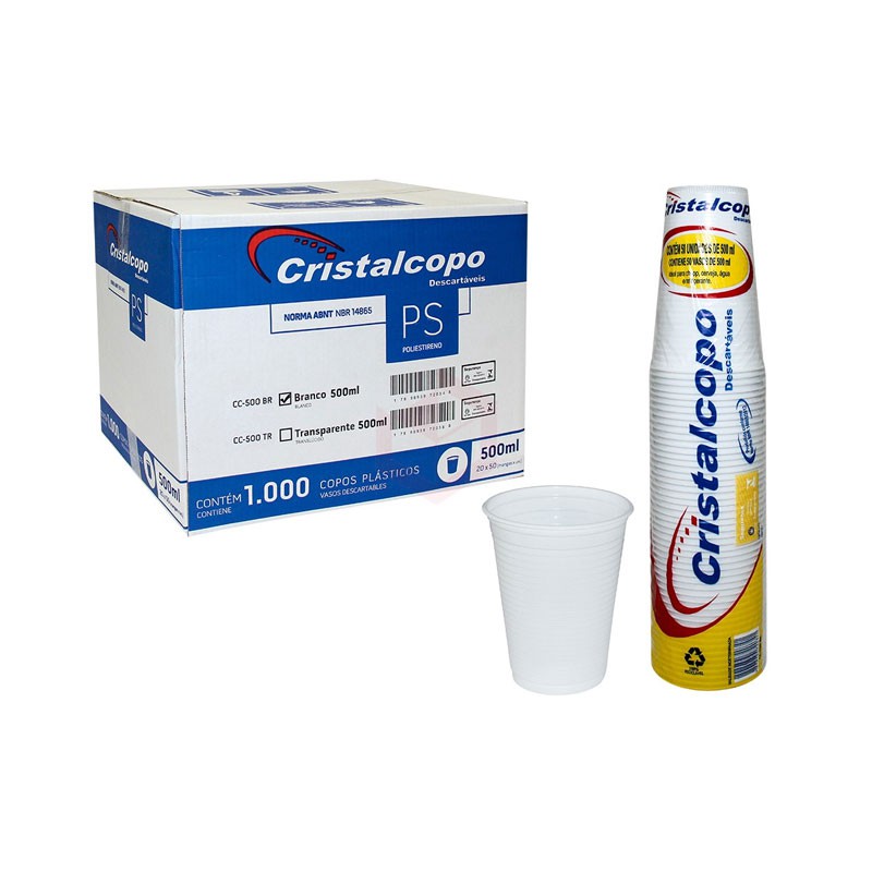 Copo plástico descartável 500ml. Marca: Cristalcopo. Caixa com 1000 unidades. Cor: Branco.