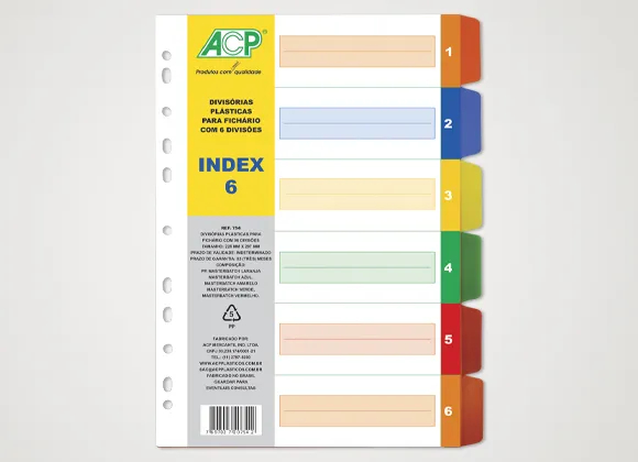Divisória para fichário A-4, plástica, colorida, com 6 projeções. Marca: ACP - REF. 754.
