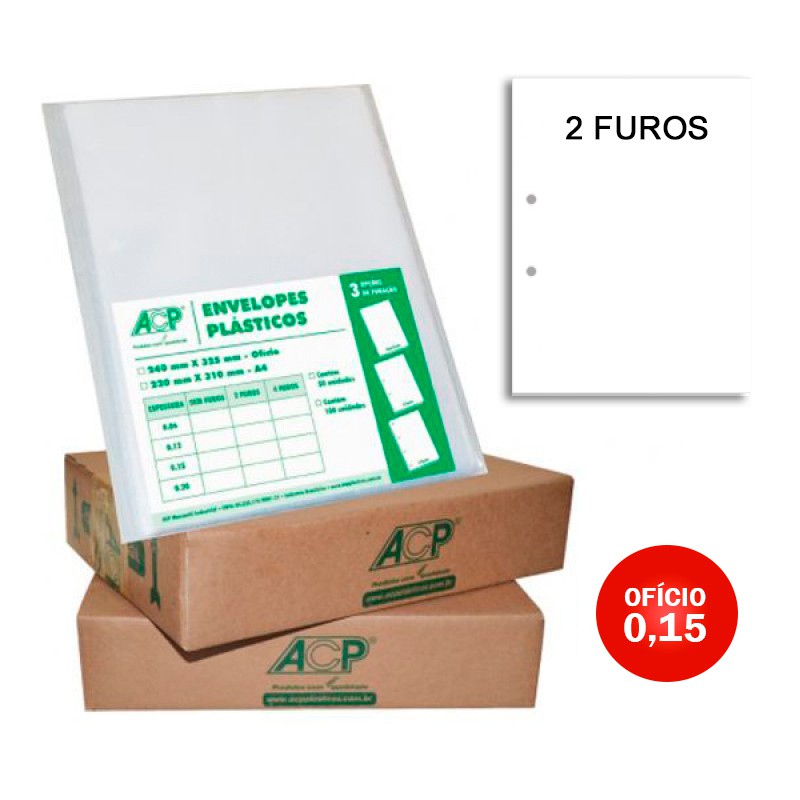 Envelope plástico 0,15, grosso, oficio, 2 furos. Caixa com 400 unidades. Marca: ACP