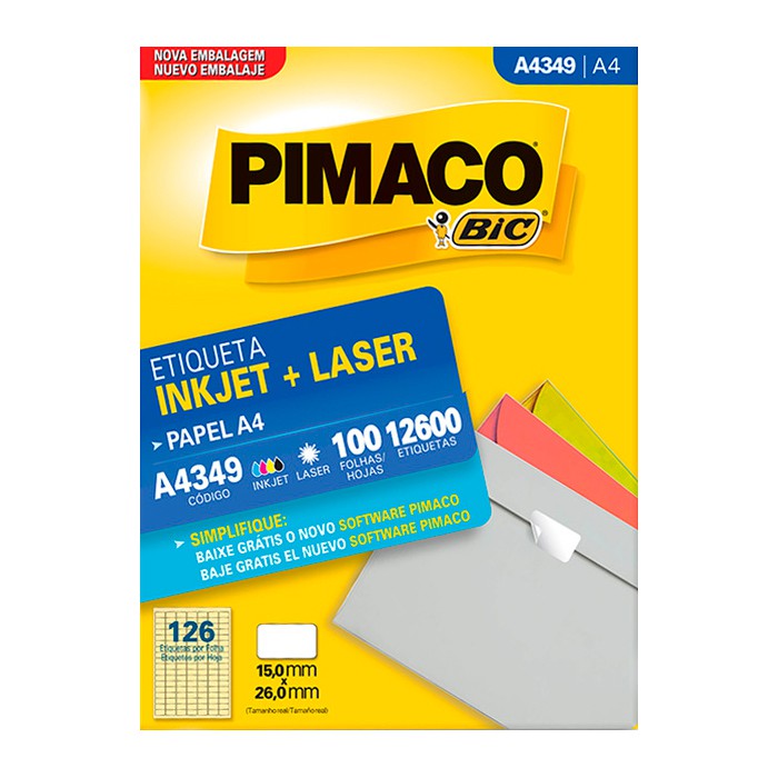 Cor branca; Etiqueta retangular; Adesivo permanente; Tamanho da etiqueta (MM) 15,0 x 26,0; Etiquetas por folha 126; Etiquetas por envelope 12600.