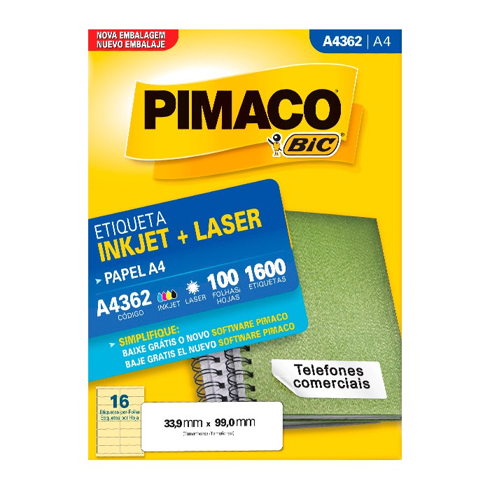 Cor branca; Etiqueta retangular; Adesivo permanente; Tamanho da etiqueta (MM) 33,9 x 99,0; Etiquetas por folha 16; Etiquetas por envelope 1600.