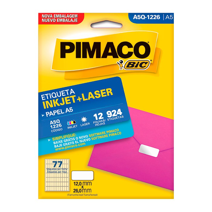 Cor branca; Etiqueta retangular; Adesivo permanente; Tamanho da etiqueta (MM) 12,0 x 26,0; Etiquetas por folha 77; Etiquetas por envelope 924.