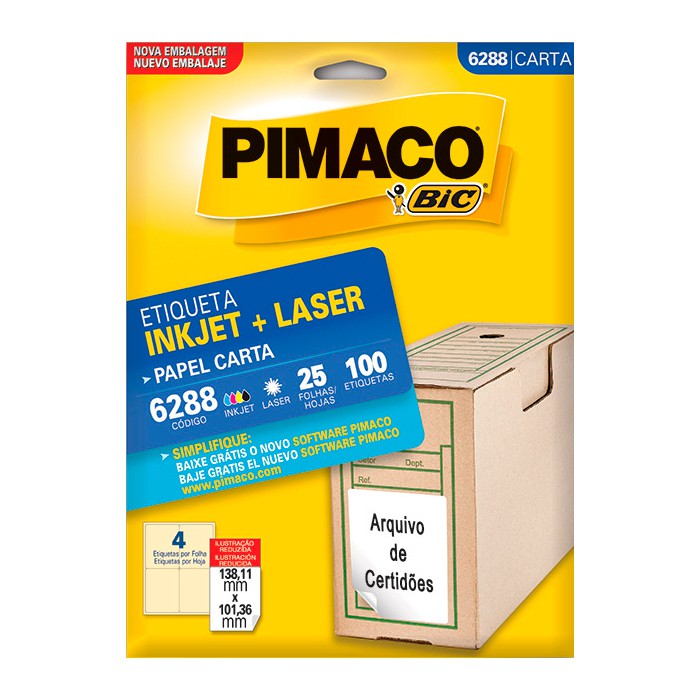 Cor branca; Etiqueta retangular; Adesivo permanente; Tamanho da etiqueta (MM) 138,11 x 106,36; Etiquetas por folha 4; Etiquetas por envelope 100.