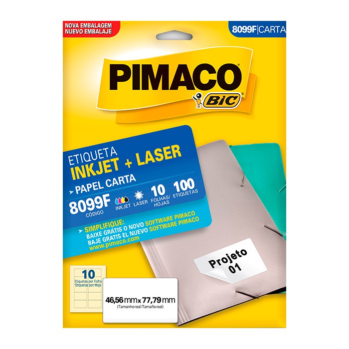 Cor branca; Etiqueta retangular; Adesivo permanente; Tamanho da etiqueta (MM) 46,56 x 77,79; Etiquetas por folha 10; Etiquetas por envelope 100.