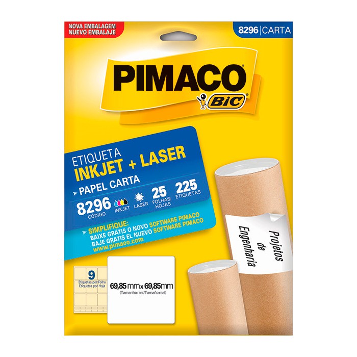 Cor branca; Etiqueta retangular; Adesivo permanente; Tamanho da etiqueta (MM) 69,85 x 69,85; Etiquetas por folha 9; Etiquetas por envelope 225.