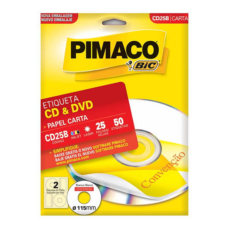 Cor branco. Etiqueta CD. Adesivo permanente. Tamanho da etiqueta (MM) 115. Etiquetas por folha 2. Quantidade de folhas 25. Etiquetas por envelope 50.