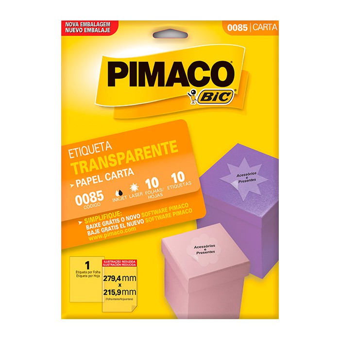 Cor transparente; Etiqueta retangular; Adesivo permanente; Tamanho da etiqueta (MM) 279,4 x 215,9; Etiquetas por folha 1; Etiquetas por envelope 10.