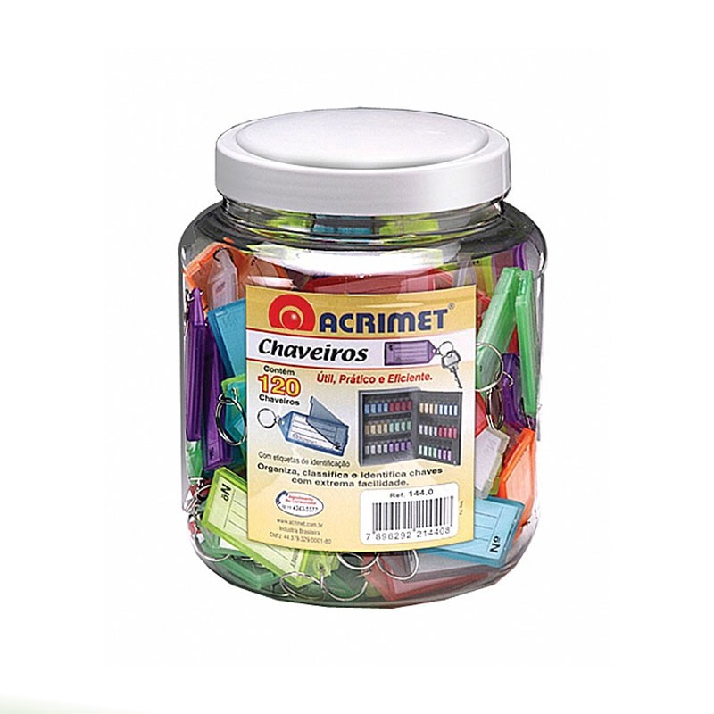 Pote com 120 chaveiros. Cores diversas. Marca: Acrimet. Modelo: 144.0. Possuem etiquetas de identificação. Organiza, classifica e identifica chaves com extrema facilidade.