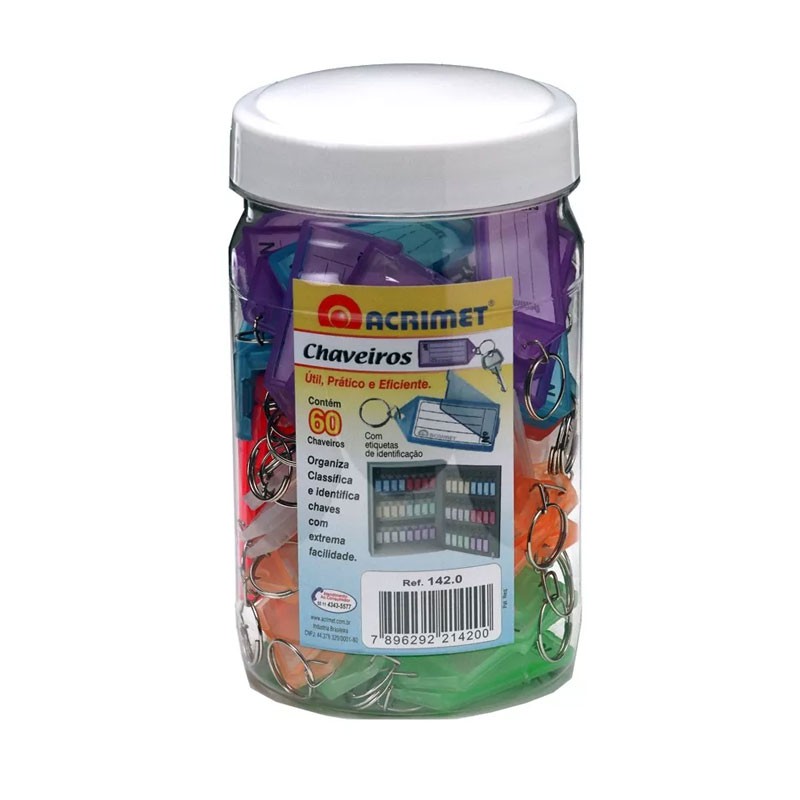 Pote com 60 chaveiros. Cores diversas. Marca: Acrimet. Modelo: 142.0. Possuem etiquetas de identificação. Organiza, classifica e identifica chaves com extrema facilidade.