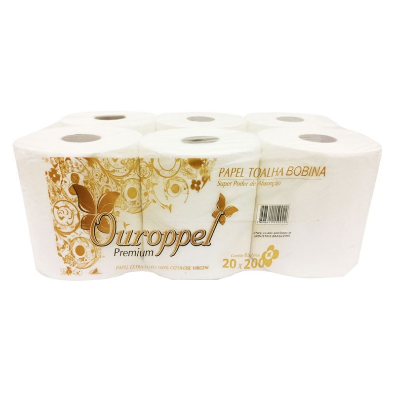 Papel Toalha Bobina Branco 20x200x6 Premium Ouroppel CX C/6 Rolos; Garante uma alta capacidade de absorção, se adaptam nos toalheiros mais comuns no mercado. Otima qualidade. Caixa C/6 rolos.