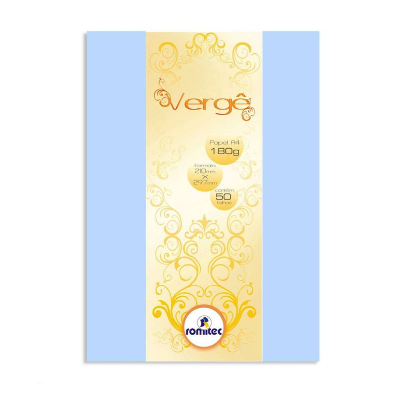 Papel vergê A-4 180g. Cor: Azul. Bloco com 50 folhas. Marca: Romitec.