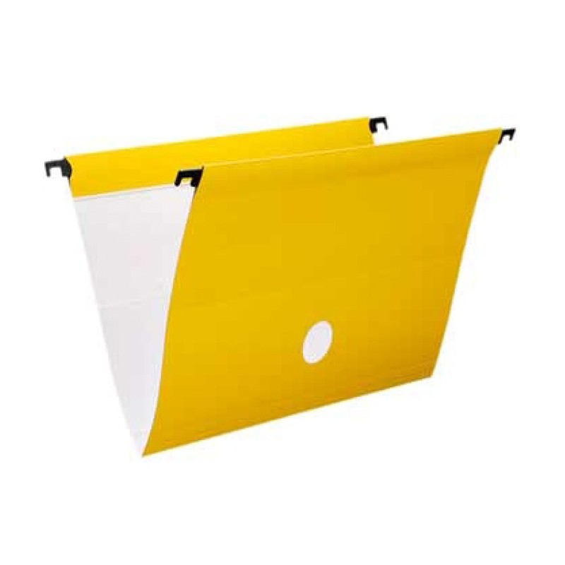 Pasta Suspensa DelloPlus Amarela 0099 em cartão altamente resistente plastificado, com haste plástica, siro, etiqueta, e grampo plástico. Com posições para visor e etiqueta. Abas coladas internamente para melhor acabamento do produto.