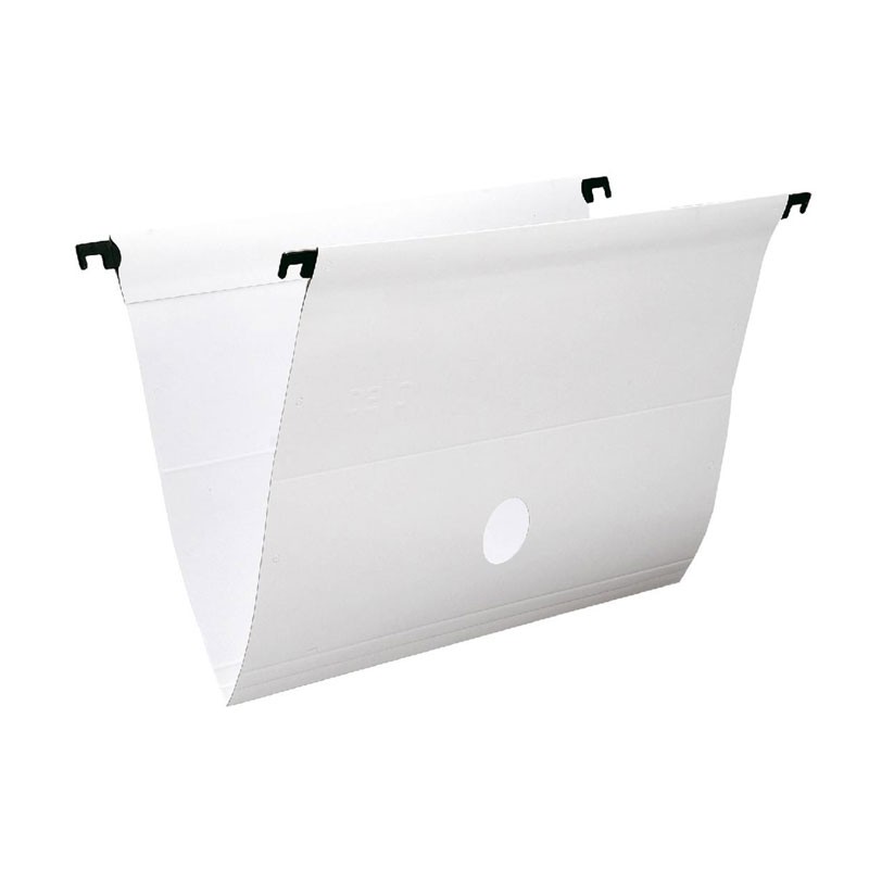 Pasta Suspensa DelloPlus Branca 0099 em cartão altamente resistente plastificado, com haste plástica, siro, etiqueta, e grampo plástico. Com posições para visor e etiqueta. Abas coladas internamente para melhor acabamento do produto.