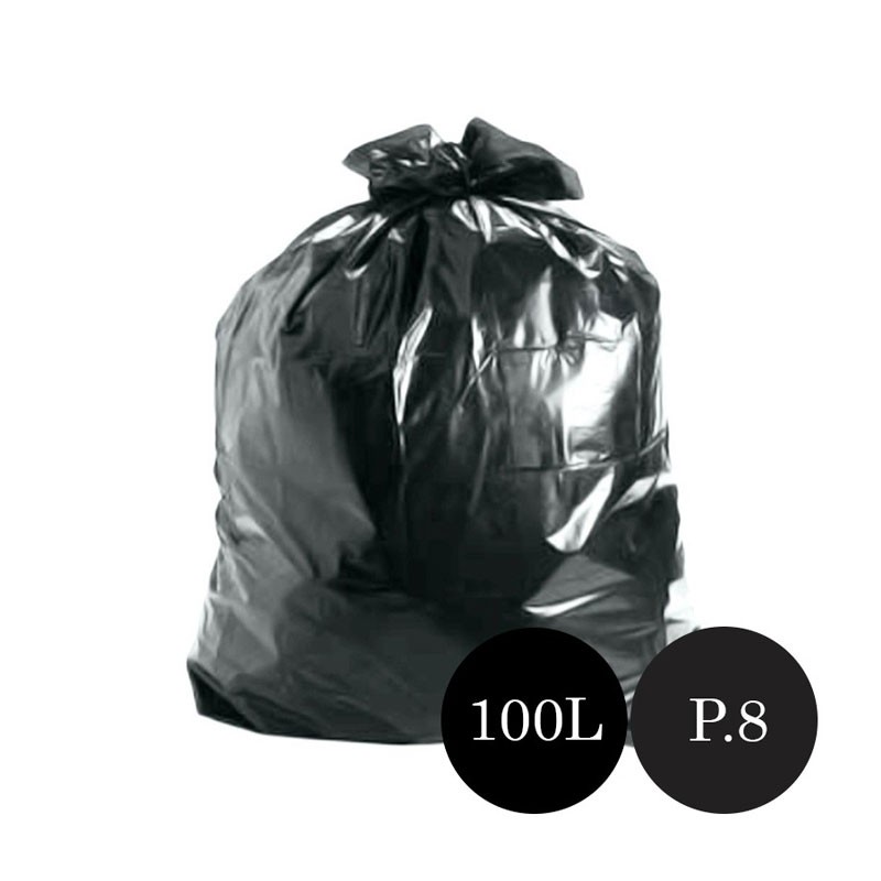 Saco de Lixo Comum Preto Reforçado P.8 com capacidade de 100 Litros. material resistente, recomendado para higienização do seu estabelecimento. Pacote com 100 unidades.