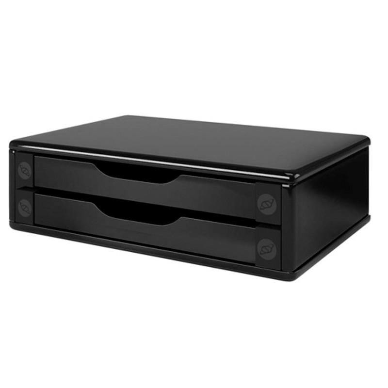 Suporte para Monitor Black Piano com 2 Gavetas. Marca: Souza. Material feito de mdf 3/6 e 9mm. Pintado com tinta laka black piano. Dimensões A x L x C: 11 x 38,5 x 25,5 - Altura das gavetas: 4 cm.